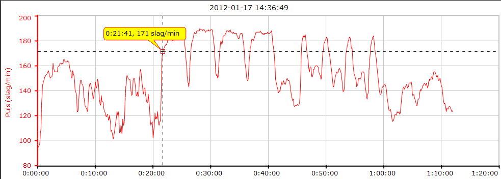 Jag lyckades hålla mig en bit över min tröskelpuls som är på 179 slag/min betydligt lättare än vanligt så pass lätt att jag la till en extraminut under den andra intervallen och ökade till 3:45  tempo, en fart som jag lyckades hålla under resten av serien. Nu var passet visserligen väldigt kort men en snittpuls under intervallerna på 187 slag/min gjorde det till veckans hittills tuffaste pass. Värt att nämna är att jag avslutade några av mitten intervallerna med en en minuts lång fartökning där jag uppnådde passets maxpuls på 201 slag/min vilket endast är 6 slag ifrån min maxpuls, det säger en del om hur hårt passet var.
