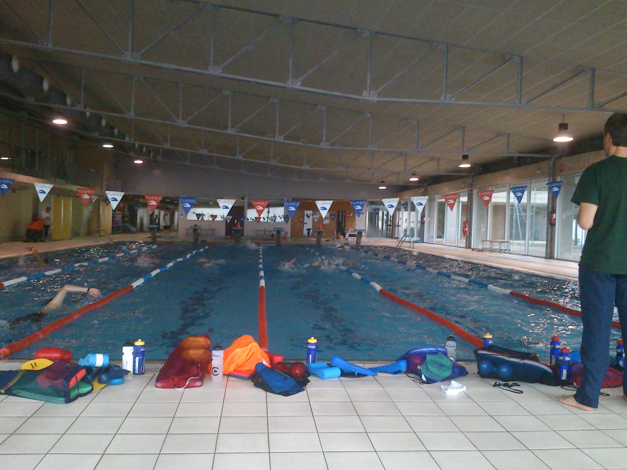 Vi började med simningen, efter ett insim bestående av 100, 90, 80 meter ända ner till 10 meter körde vi T30, dvs simma så långt som möjligt under 30 minuter. Jag hade ett riktigt bra flyt från början till slut, totalt hann jag med 2400 meter. Direkt efteråt körde vi 5 min lugnt ryggsim. Därefter var det dags för arm med paddel, 30 x 50 meter med starttiden 45.